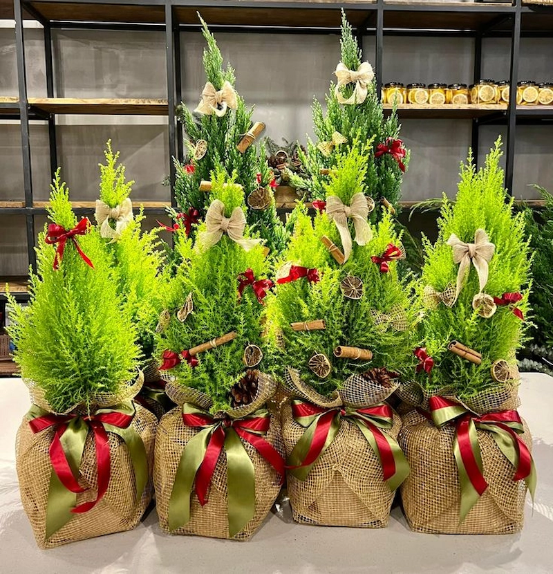 Bạn có thể sử dụng các loại cây cảnh mini như cây tùng, cây bách, cây thông nhỏ để trang trí bàn ghế, quầy pha chế. Cành thông, lá holly, quả thông có thể được sử dụng để trang trí vòng nguyệt quế, hoặc cắm vào lọ để tạo điểm nhấn tự nhiên.